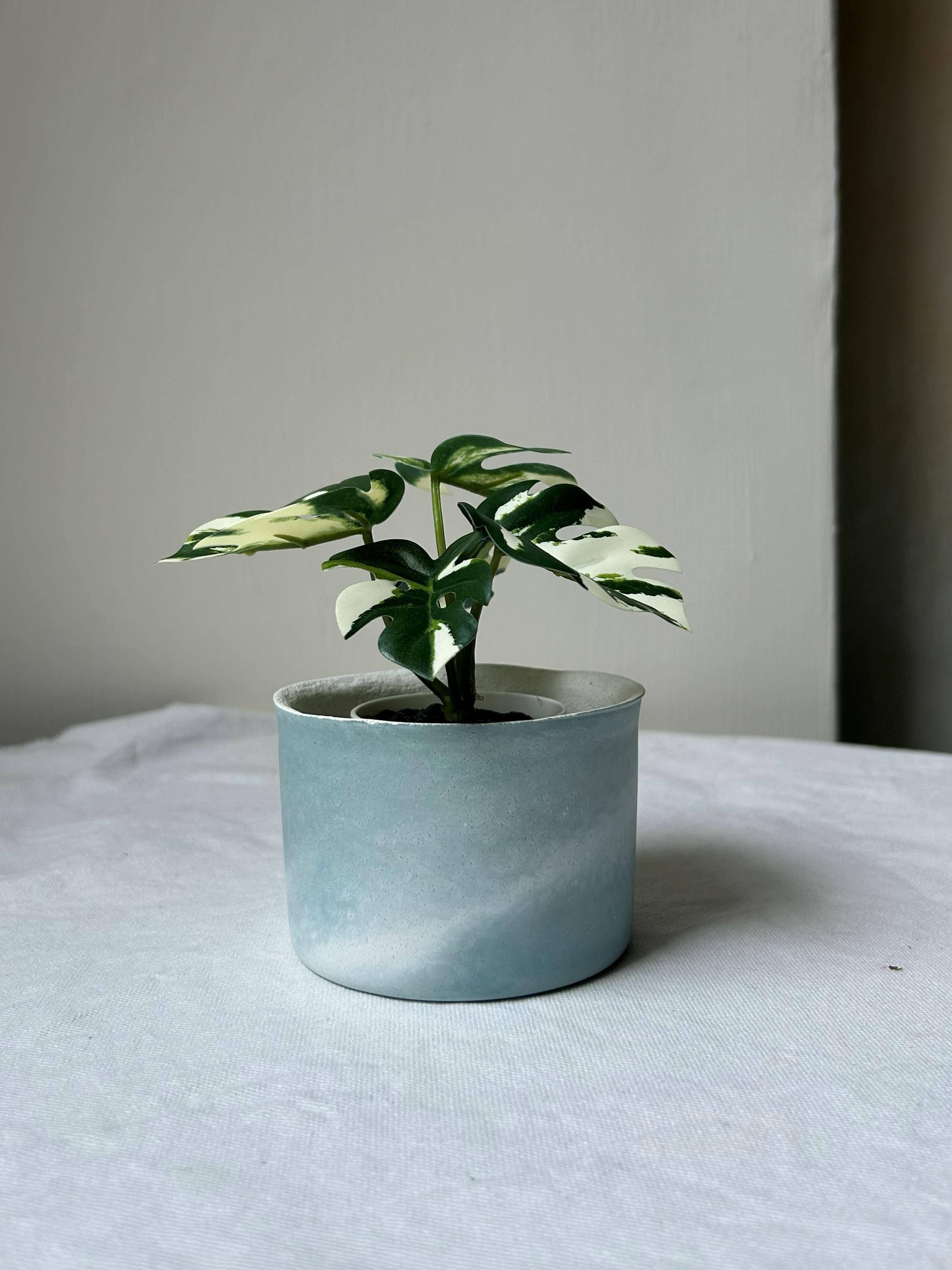 使用水泥與混和媒材,慢慢一層一層疊上,別於一般灌注方式製成輕薄的盆型。